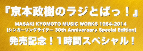 | 2014.5.31 | ![]() AM1314ラジオ大阪 17:00〜18:00 「MASAKI KYOMOTO MUSIC WORKS 1984-2014 [シンガーソングライター 30th Anniversary Special Edition]発売記念! 『京本政樹のラジとばっ!』1時間スペシャル!」 「忍ジャニ参上! 未来への戦い」映画公開を記念し、忍者ジャニコーナーゲストとして森本慎太郎、京本大我が登場!! |