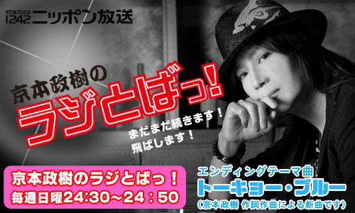 | 2014.10.12 | ![]() AM1242ニッポン放送:毎週日曜 24:30〜24:50『京本政樹のラジとばっ!』 リクエスト、質問、悩み相談などドシドシ募集中♪ kyomoto@1242.com |