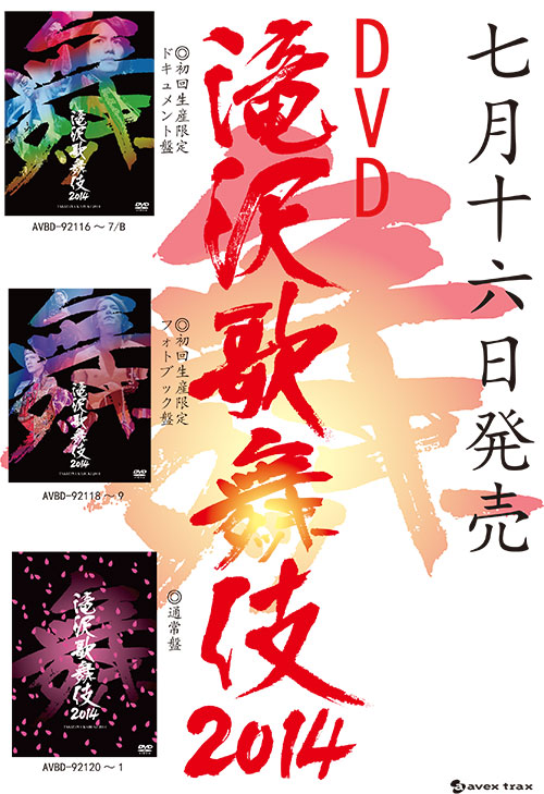 | 2014.7.16 | ![]() 「滝沢歌舞伎2014」がファン待望のDVD化! 【初回生産限定ドキュメント盤】DVD3枚組 AVBD-92116〜7/B/¥9,000+税 ご予約はこちら |
