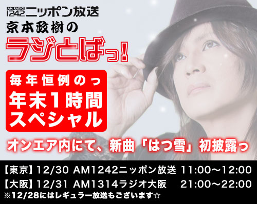 | 2014.12.30〜2014.12.31 | ![]() 東京『AM1242ニッポン放送11:00〜12:00京本政樹のラジとばっ!』年末特番! <http://radiko.jpでもお聞きいただけます♪> |